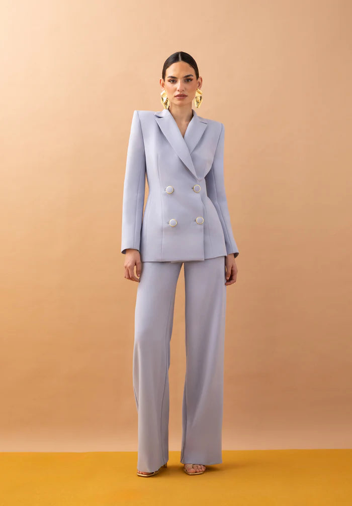 Chaqueta sastre realizada en crepé, cruzada con botones forrados en el mismo tejido.