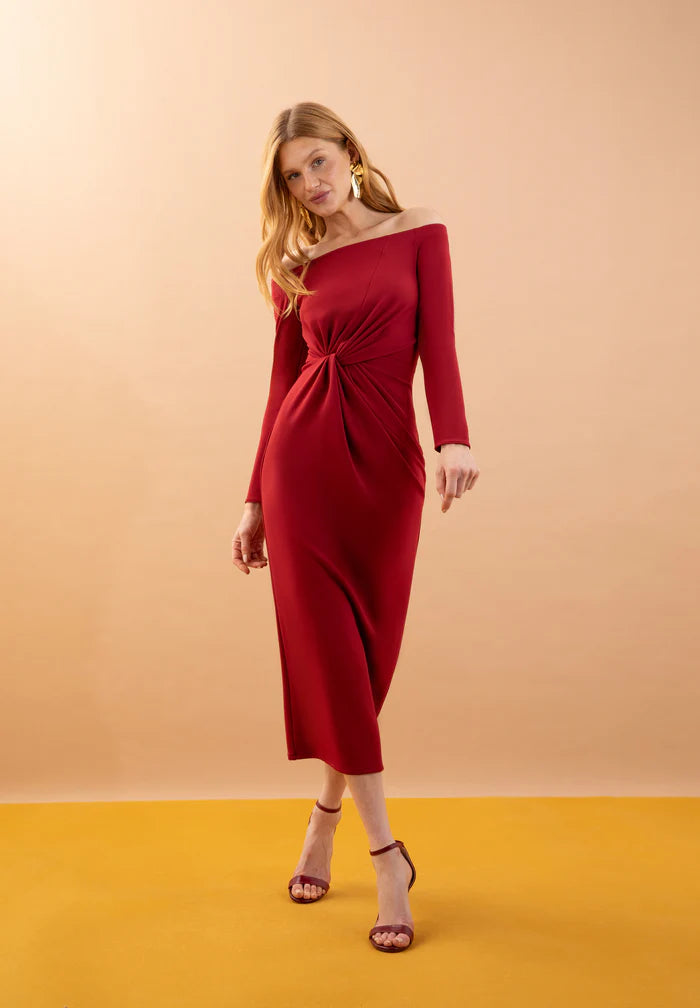 Vestido de punto con manga larga y escote bardot. Cortes que se encuentras con un nudo en el cuerpo.