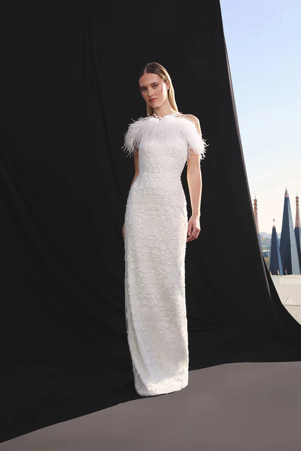 Vestido palabra de honor realizado totalmente en piedra con plumas natural de ave que recorre el escote delantero y espalda.