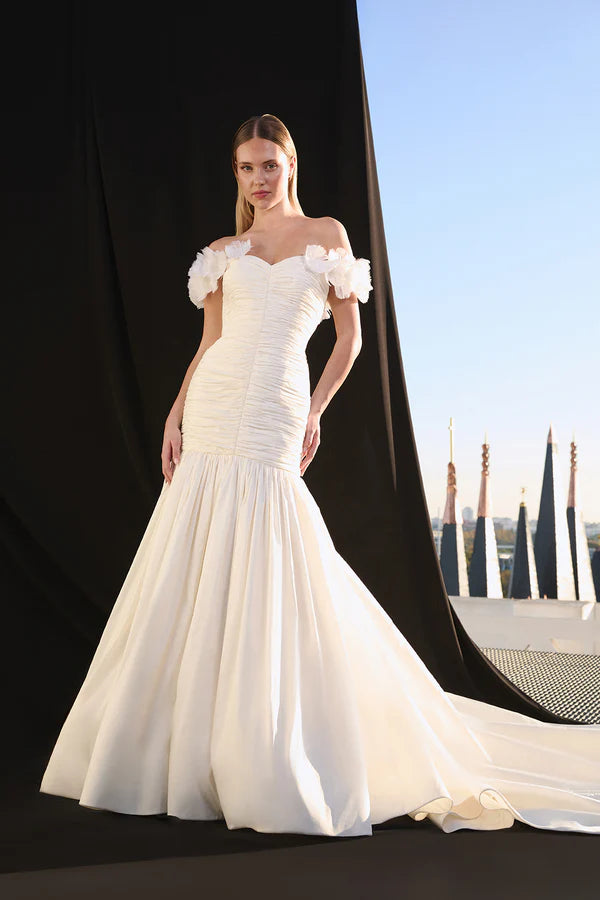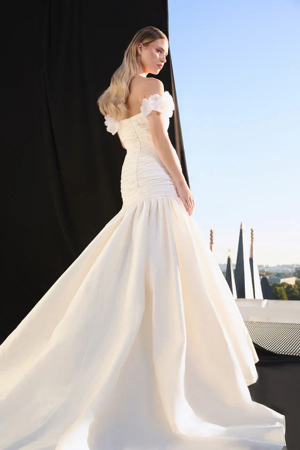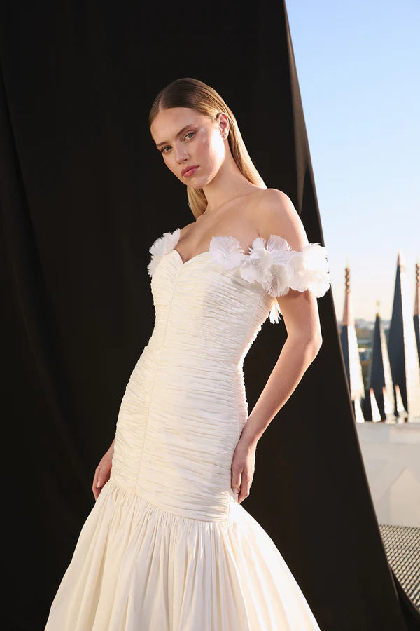 Vestido palabra de honor con escote corazón realizado en tafeta con cuerpo totalmente drapeado a mano. Flores de pluma natural que rodean los brazos